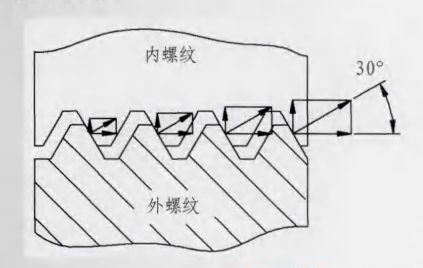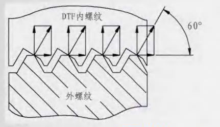 DTFLOCK螺母在內(nèi)螺紋的牙底處有一個30°的楔形斜面,當(dāng)螺栓、螺母擰緊時(shí),螺栓的牙尖就緊緊地頂在螺母的楔形斜面上,從而產(chǎn)生了很大的鎖緊力。由于牙形的角度改變,使施加在螺紋間接觸所產(chǎn)生的法向力與螺栓軸成60°角(見圖2),而不是像普通螺紋那樣的30°角,DTFLOCK螺紋法向壓力遠(yuǎn)遠(yuǎn)大于扣緊壓力,因此,所產(chǎn)生的防松摩擦力也就必然大大增加了。